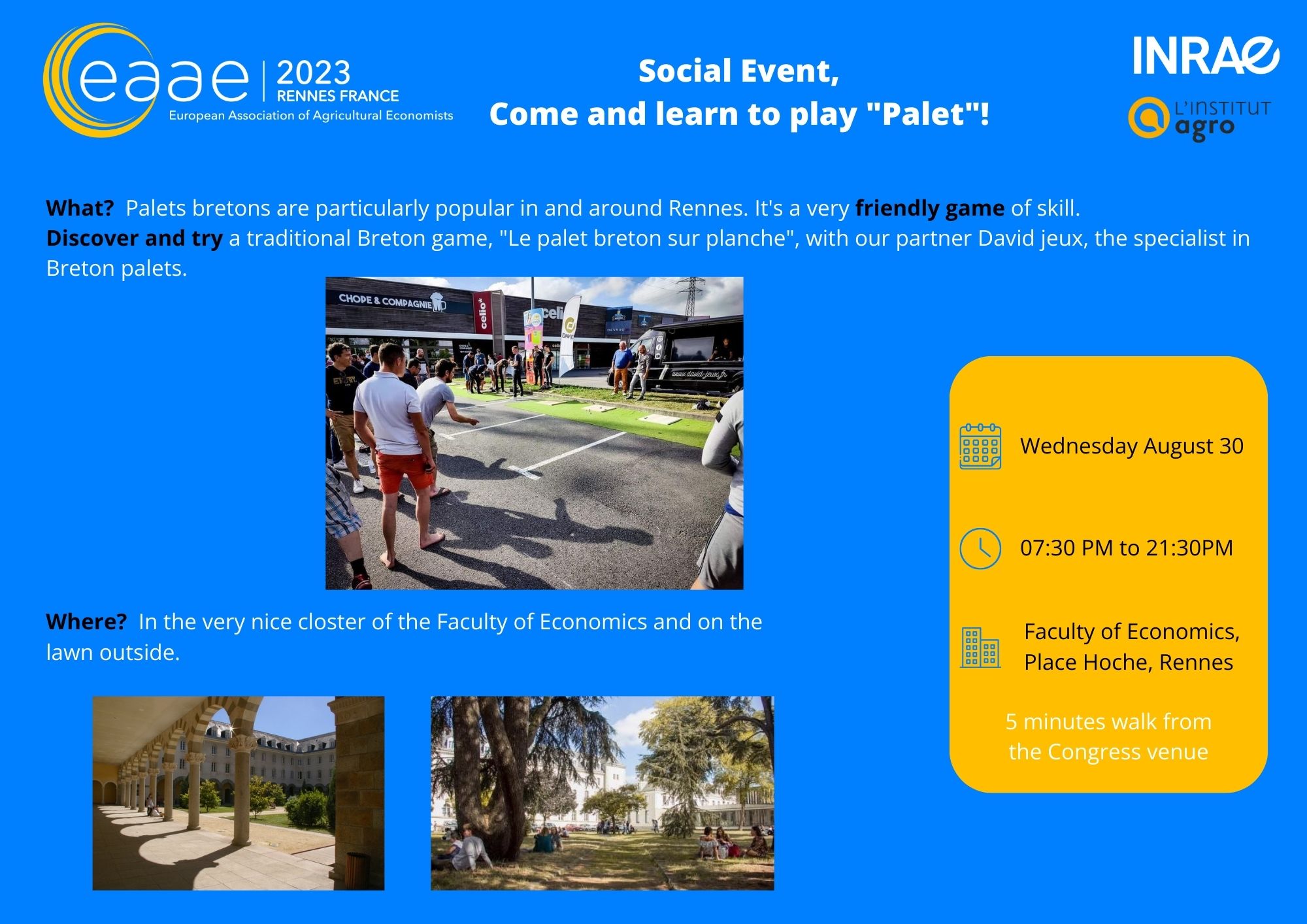 During the evening, you can enjoy two activities! The first is a sporting activity with our colleagues Alexandre Gohin & Marilyne Huchet: running along the river. The second, discovering a local game: "Le palet Breton".